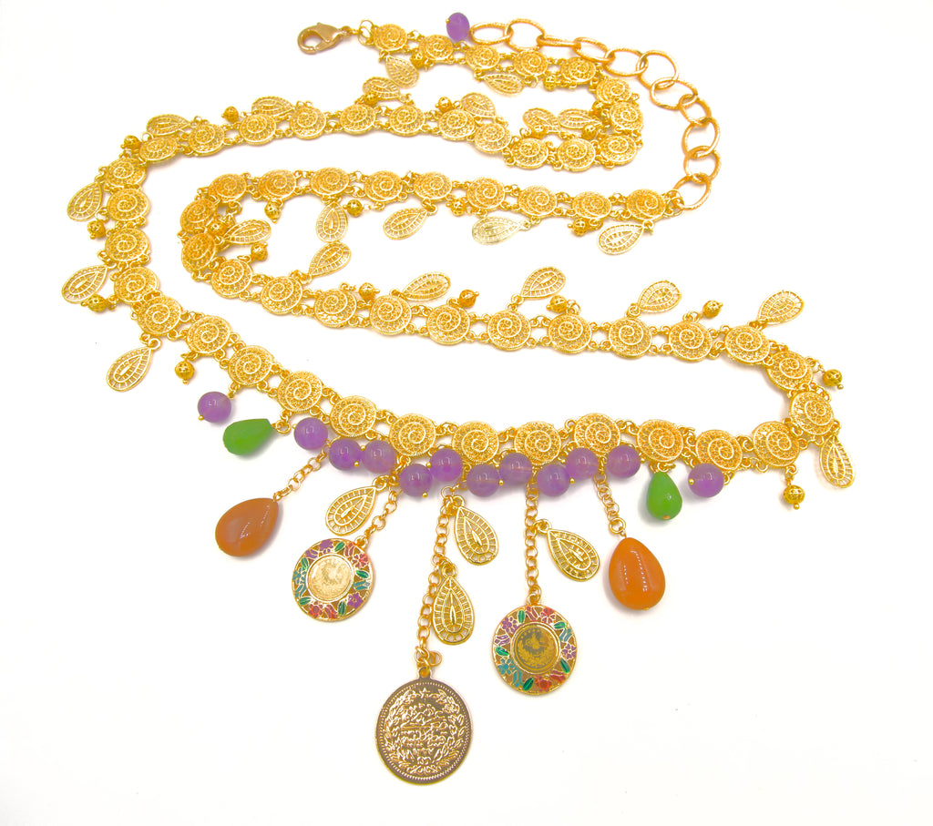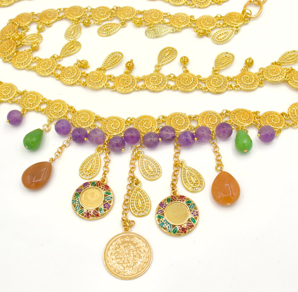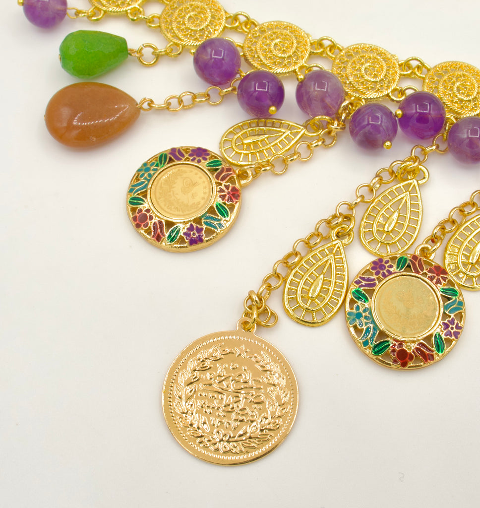 It features a stunning dangling Turkish coin with historical significance, accented by vibrant multi-colored gemstones, Amethyst, Aventurine, Jade, dangling from the chain, creating a unique, eye-catching accessory for any special occasion.