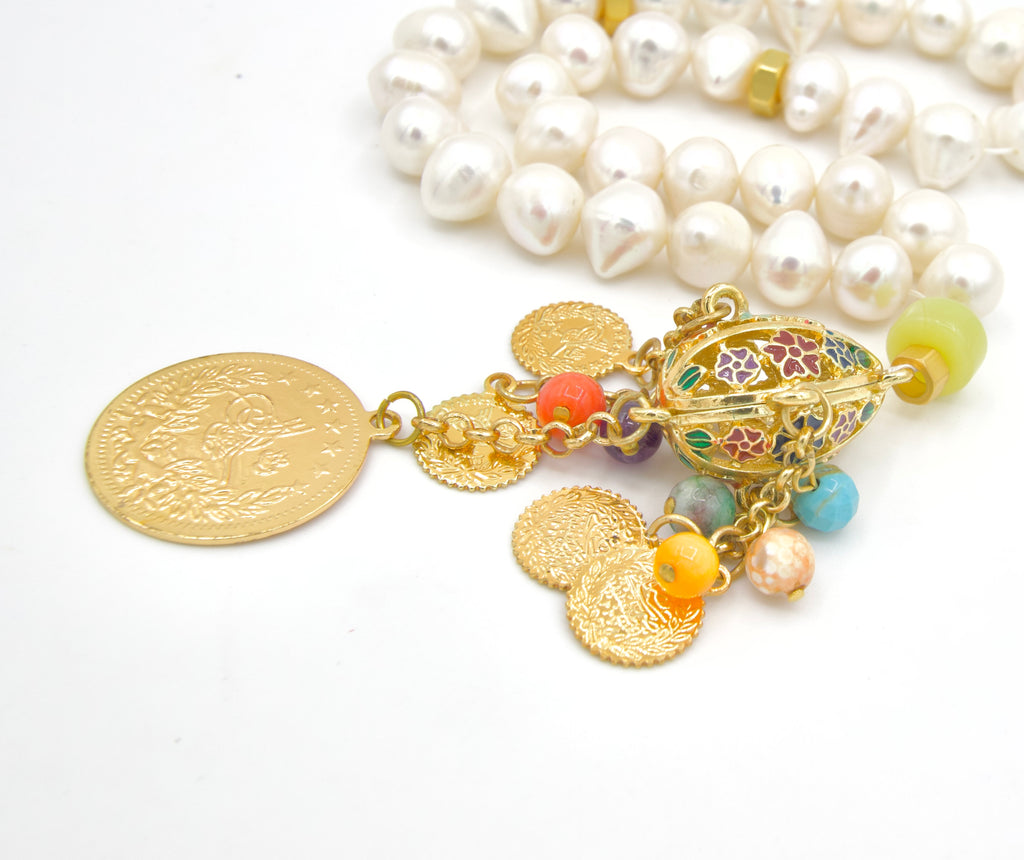 Multicoloured stones and gold coins are dangling from the gold bead.