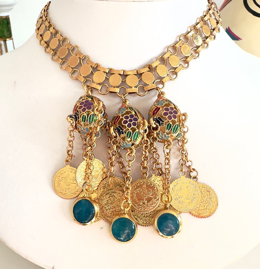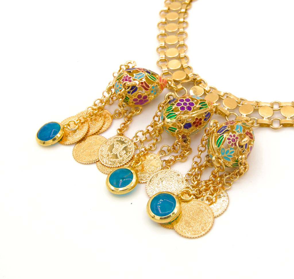 Three lustrous, enameled beads dangle elegantly from the special chain while GOLD TURKISH COINS and a smooth, vibrant blue JADE stone, are suspended from the beads, creating a striking piece that shimmers with every movement.